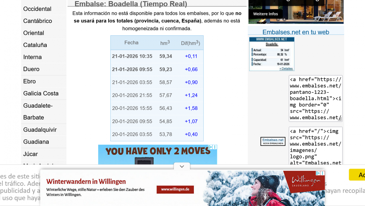 Der Stausee Darnius (früher Boadella) ist momentan übervoll. Seinen Höchststand hatte er gestern mit 61,83 Hektokubikmetern Wasser. Normalerweise ist seine höchste Kapazität bei 61 Hektokubikmetern.